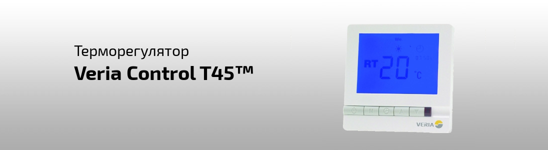 Veria Control T45 - це прогресивний, але простий в використанні, оснащенний таймером термостат з великим цифровим LCD, який може використовуватися для контролю за нагріванням вашої підлоги задопомогою датчика підлоги, кімнатного датчика або комбінації їх обох.